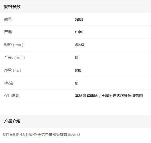 產品名字:世達10件套6.3MM系列65MM長抗沖擊雙頭旋具頭#3/#3