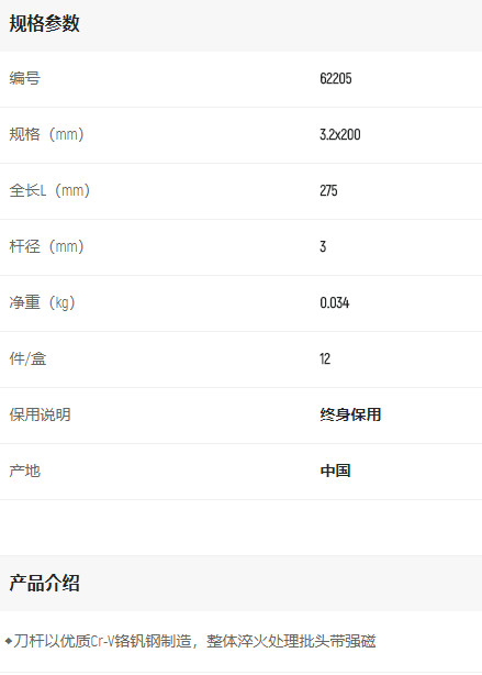 首頁>產品中心>螺絲批>一字螺絲批>世達A系列一字批3.2mm*200mm
