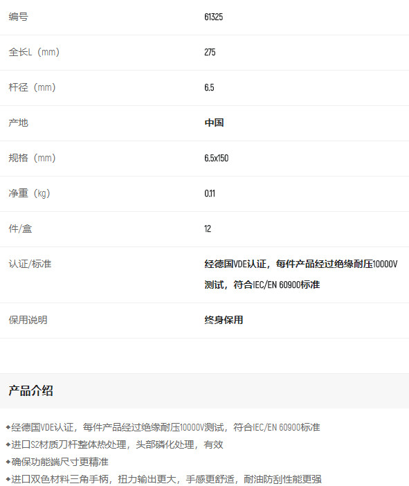 產品名字:世達T系列雙色柄一字絕緣螺絲批6.5x150MM